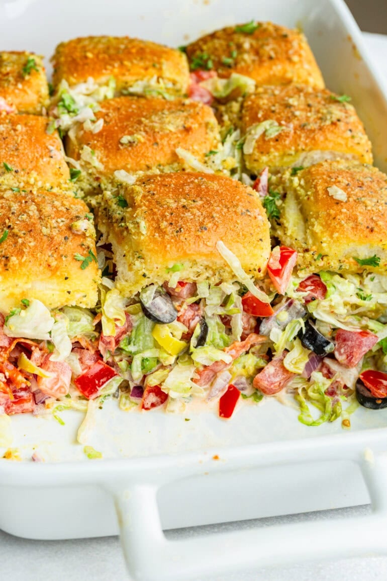 For extra flavor, you drizzle some garlic parmesan sauce on top, then bake them until golden and crispy. To finish, load them up with your favorite sandwiches toppings like lettuce, tomatoes, pepperoncinis and black olives mixed with a creamy Italian dressing. These sliders are delicious, easy to assemble, and perfect for a crowd!