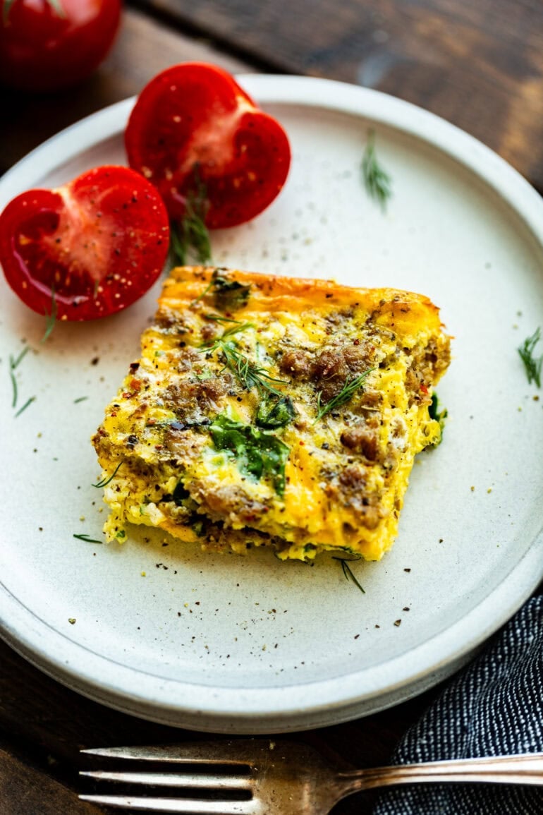 I created this low-carb spinach and sausage egg casserole based on our other egg casserole recipes, but I really wanted an easy, cheesy breakfast casserole with crumbled sausage for a hearty, but still healthy, start to your morning.