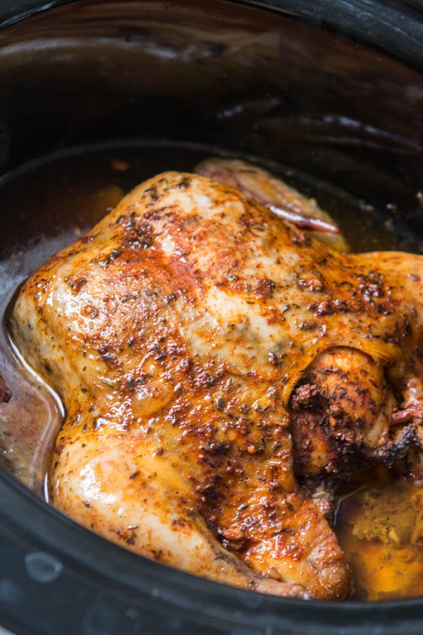 There’s nothing like cooking a whole chicken in a crock pot. It’s the easiest way to do it as there’s no tying of kitchen twine, no roasting pan, no watching the oven and the internal temperature. You just set it and forget it.