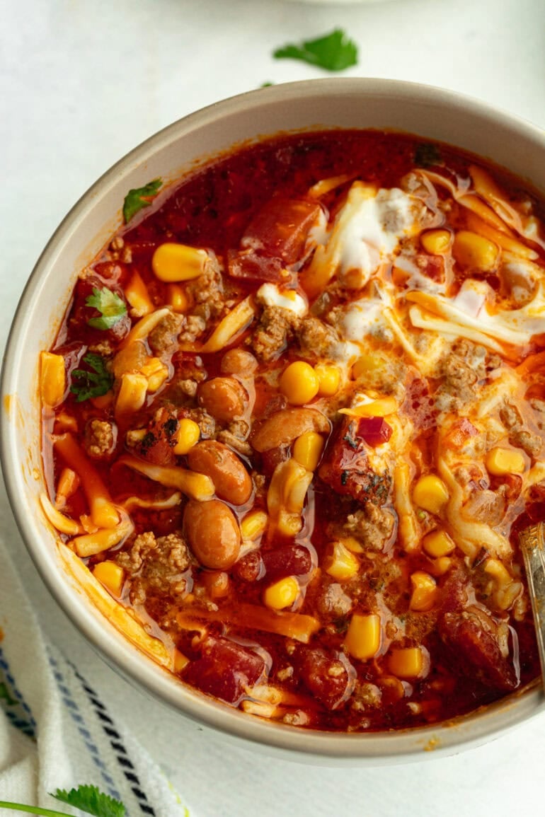 You can top your taco soup with anything you’d normally add to a taco. Some of our favorites include shredded cheese, sour cream or Greek yogurt, Fritos, pickled jalapeños, avocado, diced tomato, chopped onion, hot sauce, and green chiles. For extra freshness, add a squeeze of lime juice right before serving. You can also serve it with warm tortillas or tortilla chips!