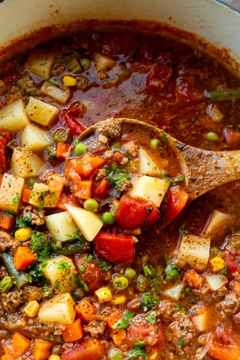 This ground beef vegetable soup with potatoes is the perfect mix of healthy and hearty. A simple recipe that’s freezer-friendly, budget-friendly, and always delicious!