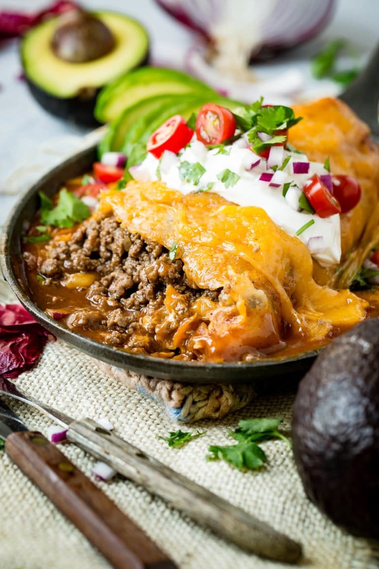 Prepare yourselves for a burrito full of the most flavorful saucy ground beef and topped with a bold red sauce and gobs of melted cheese!
