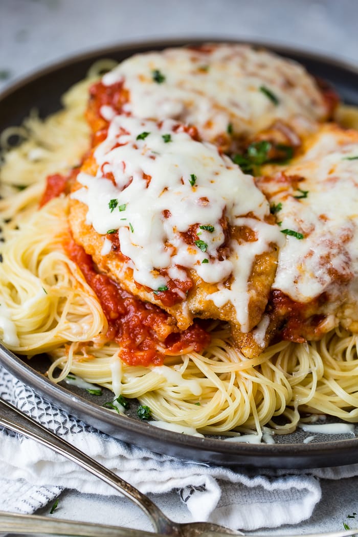 We’ve found that mashed potatoes are a great option, or we really like to use a very small amount of sauce on top and serve it over mixed greens with a little lemon juice and olive oil. In that method we try to use less mozzarella and more parmesan cheese instead. It’s so good. Don’t look at the photo but try this version if you want a healthier Parmesan Chicken recipe.