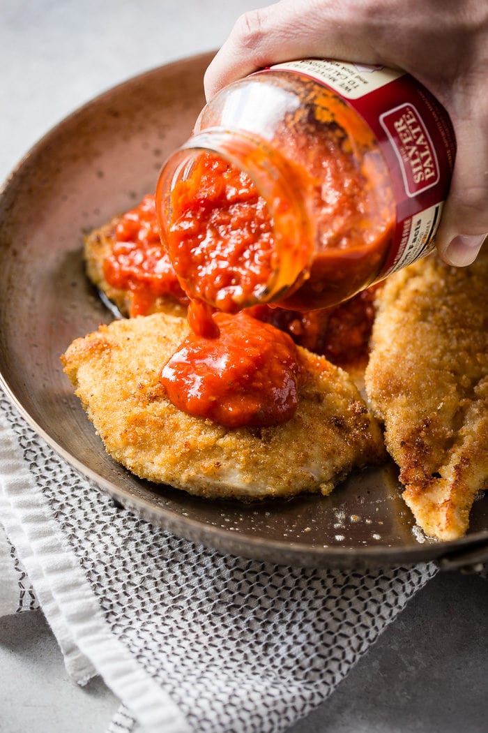 They are crisp, flavorful and have more texture than breadcrumbs normally do so you’re in for an awesomely delicious filet of chicken, so really it’s how to make chicken parmesan without breadcrumbs!