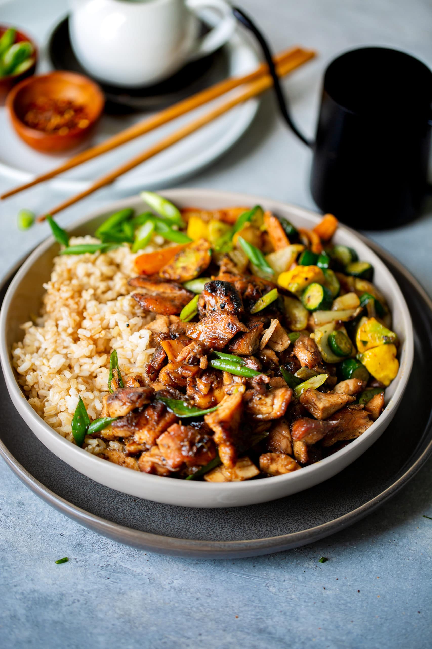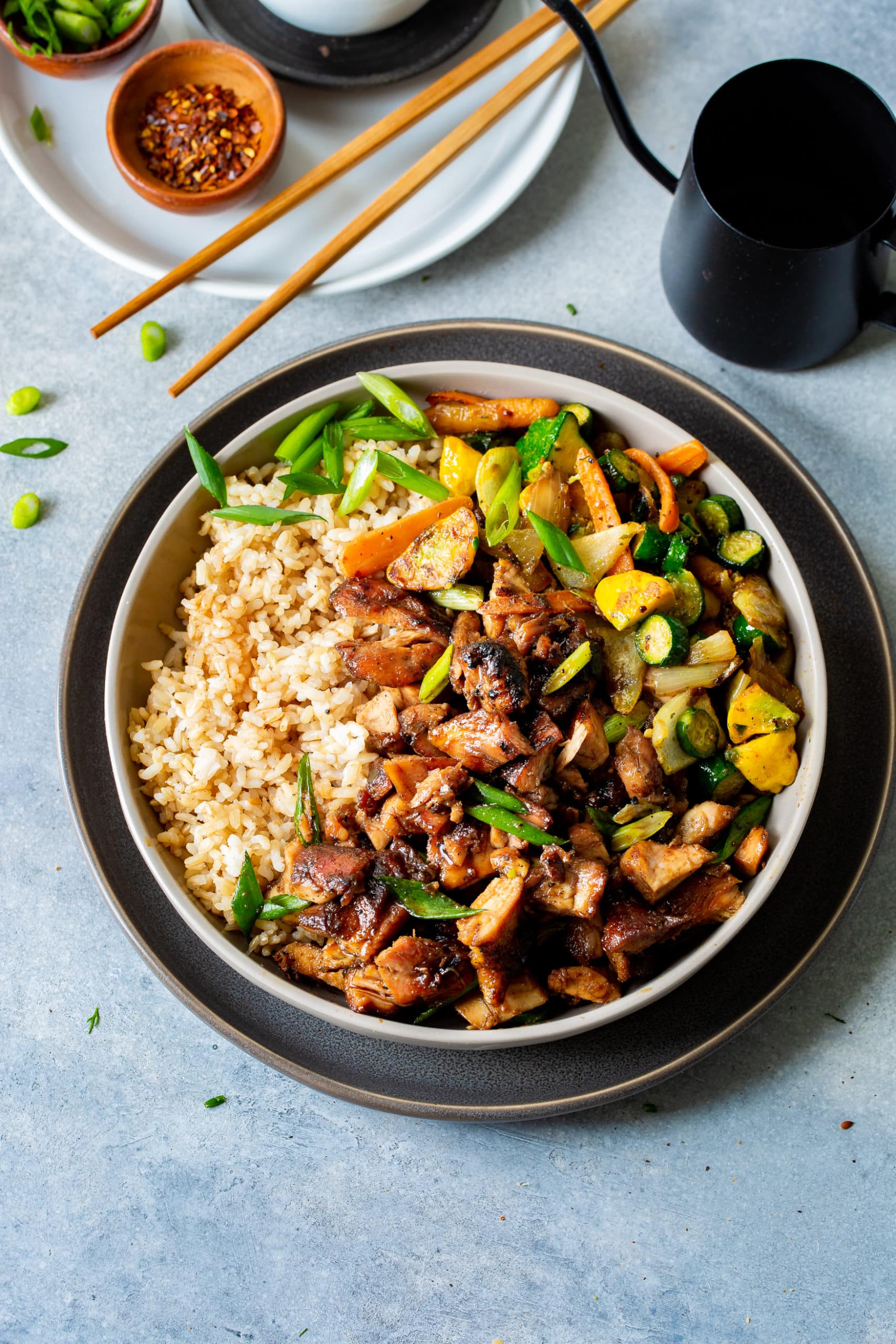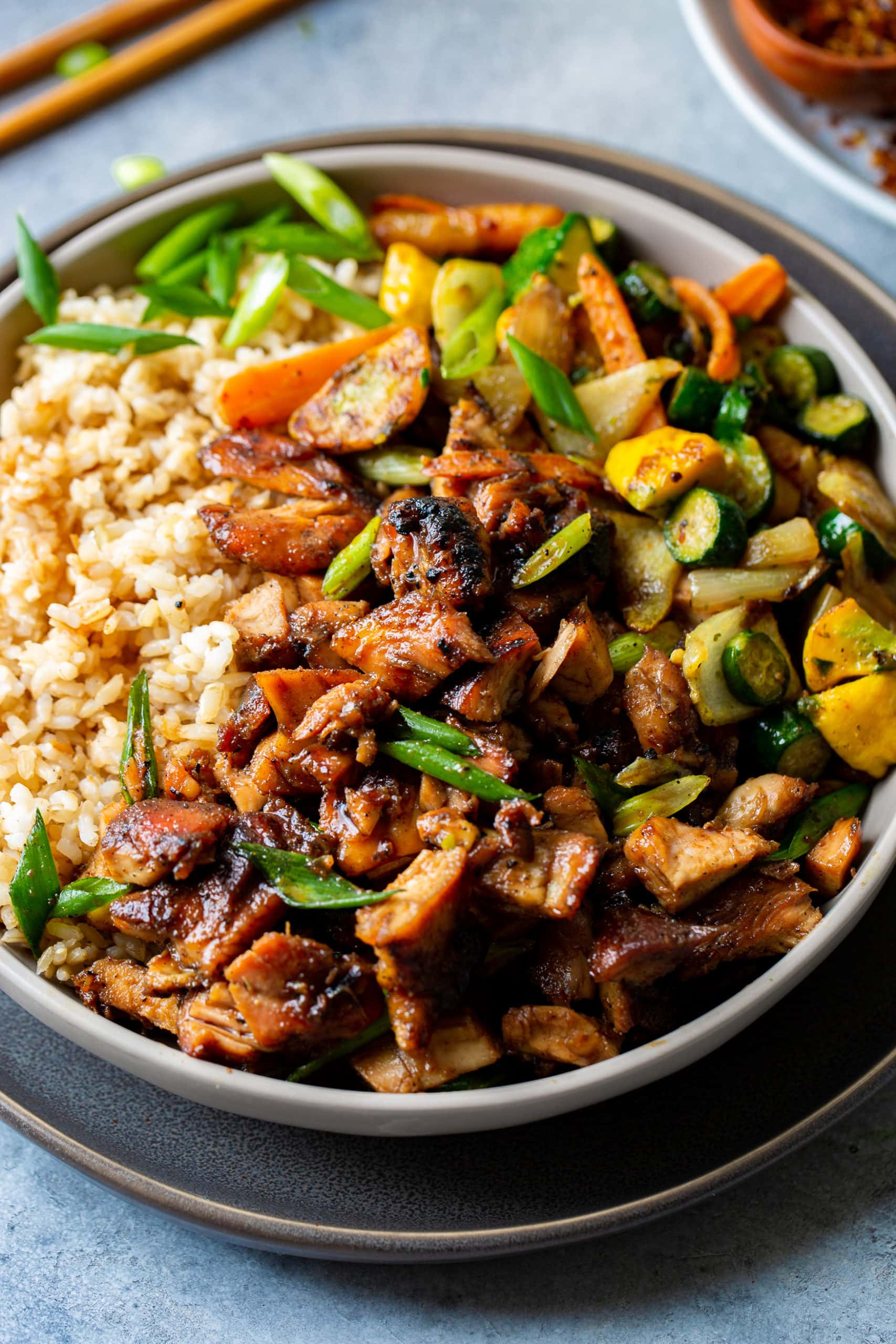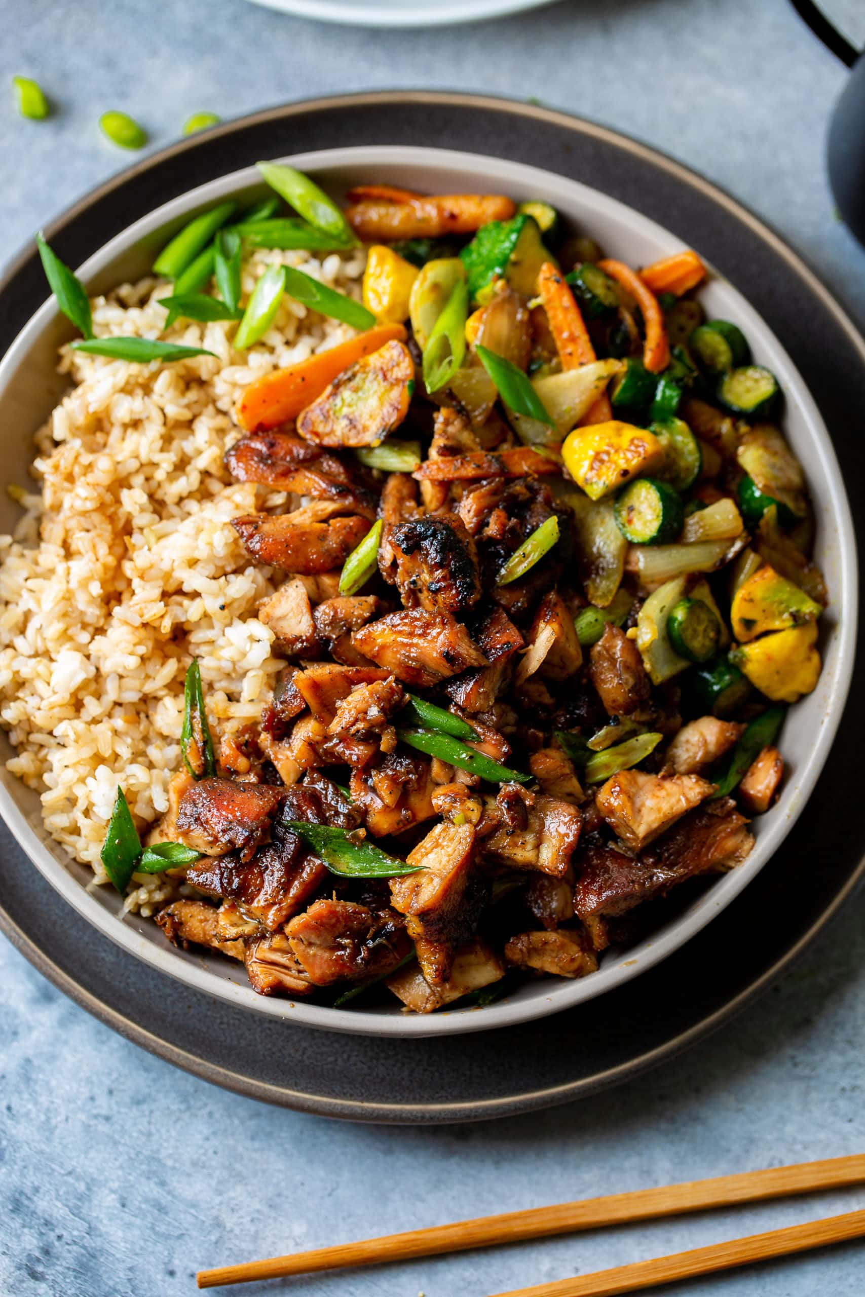 We like to serve this chicken over steamed rice or fried rice with a side of sautéed veggies. For veggies like in the photos, slice baby carrots, yellow squash, zucchini, and onion. Heat olive oil in a skillet over medium-high heat, sauté the onion until almost translucent, then add the other veggies with salt and pepper. Cook until golden on one side, then flip and cook the other side.
