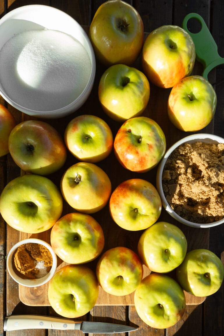 - Apples: You’ll need about 16 apples depending on the size of the apples to get 6 lbs of apples. Weigh the apples first and then core, peel and cut them.