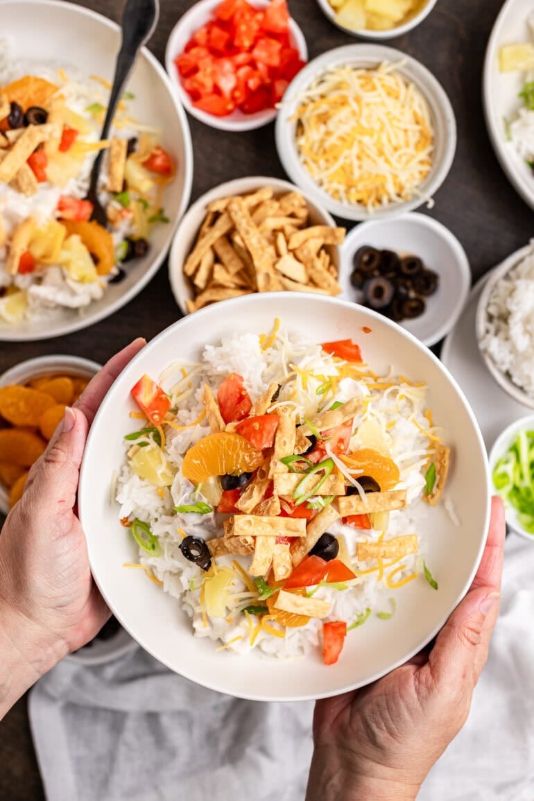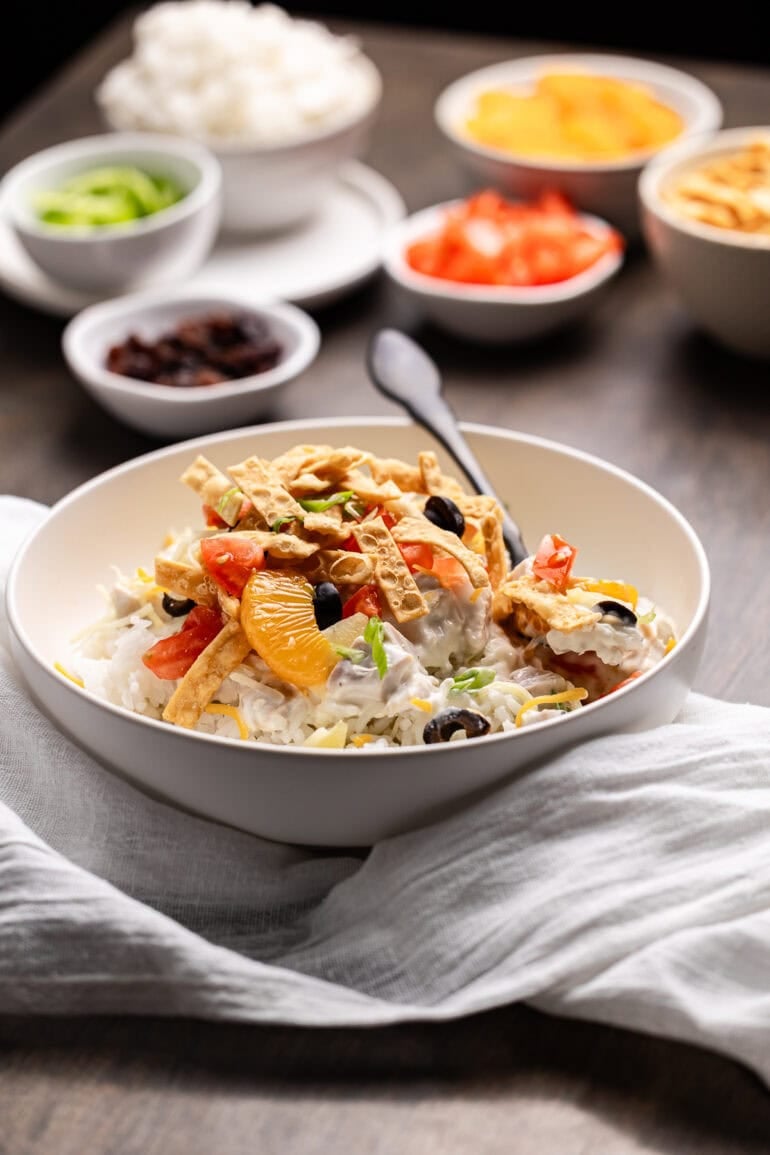 Alright, alright! I’m clearly not in Washington anymore, Toto. I’ve lived in Utah for well over a decade now, and Utah loves food and family—and you better get on board or risk being an outcast…ha! A Hawaiian haystack, also known as a “chicken sundae,” is a convenience dish with a rice base topped with chicken gravy, diced pineapple, tomatoes, Chinese noodles, cheese, and really whatever you want for a topping.