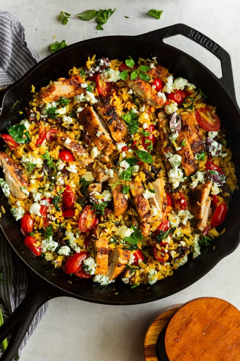 Our 30-minute one-pan Greek Chicken and Lemon Rice dinner is packed with so much flavor you’ll be shocked by how easy it is! This healthy Mediterranean recipe uses lemon rice, chicken, spinach, grape tomatoes, feta cheese, and classic Greek spices. It’s an easy, one-skillet chicken and rice recipe that is healthy, gluten-free, high-protein, a great source of fiber, and can be easily made dairy-free.