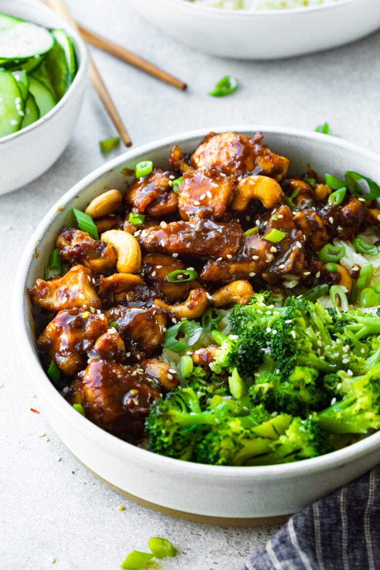a photo of a bowl of tender bites of chicken coated in a bold sauce and mixed with cashews all next to steamed broccoli florets.
