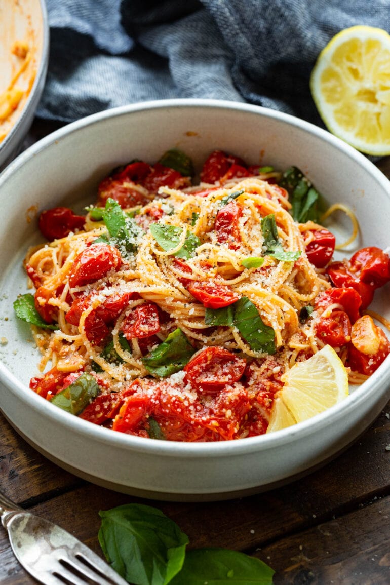 If you’re looking to add to your options for weeknight dinners, try this easy angel hair pasta recipe! It is loaded with cherry tomatoes bursting with flavor, fresh basil leaves, and garlic, all topped with parmesan cheese. It’s simple and on the table in less than 30 minutes!