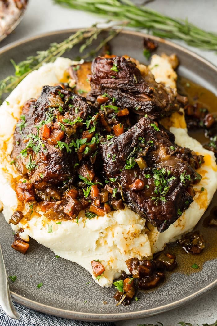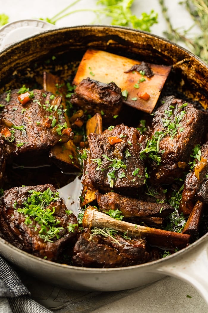 Alright, we’ve talked about a lot, but cooking short ribs in the oven is truly the best method for fall off the bone goodness. This is because the heat is coming from all angles and the pot is completely sealed, allowing the steam and heat to really break down the fibers and fat, melting everything into perfection.