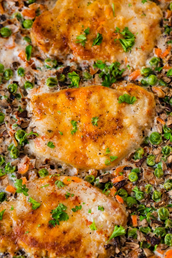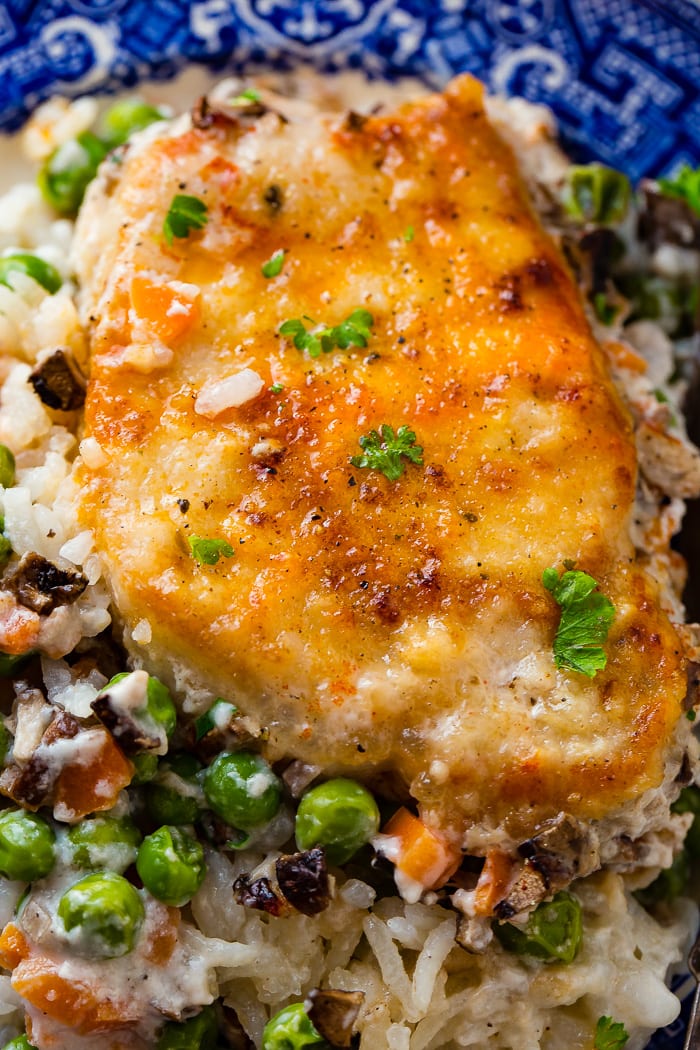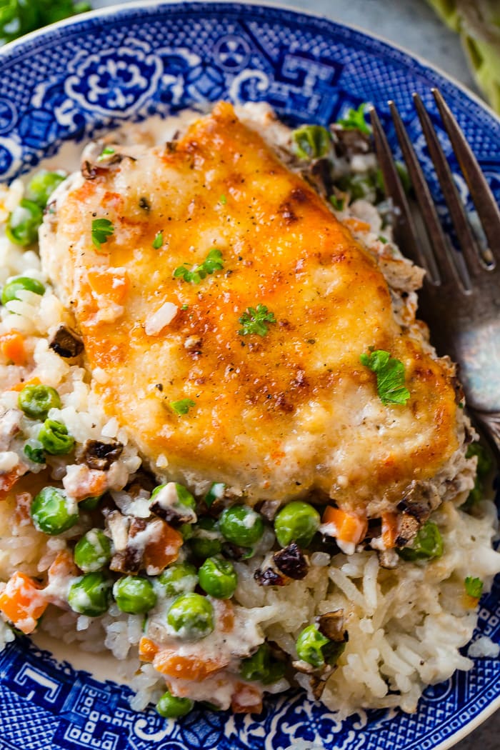 I’ll let you in on a little secret here…I love the pork chops in this dish, but the rice and veggies are my favorite. I’m so glad I grew out of the veggie-hating phase! These veggies are so tender, and the mushrooms add such a delicious earthy flavor. I’m not exaggerating when I say this part of the dish is delish because all of my kids ate them! Shocker of the century! I triple dog dare you to try this dish on your family too! Its a guaranteed hit!